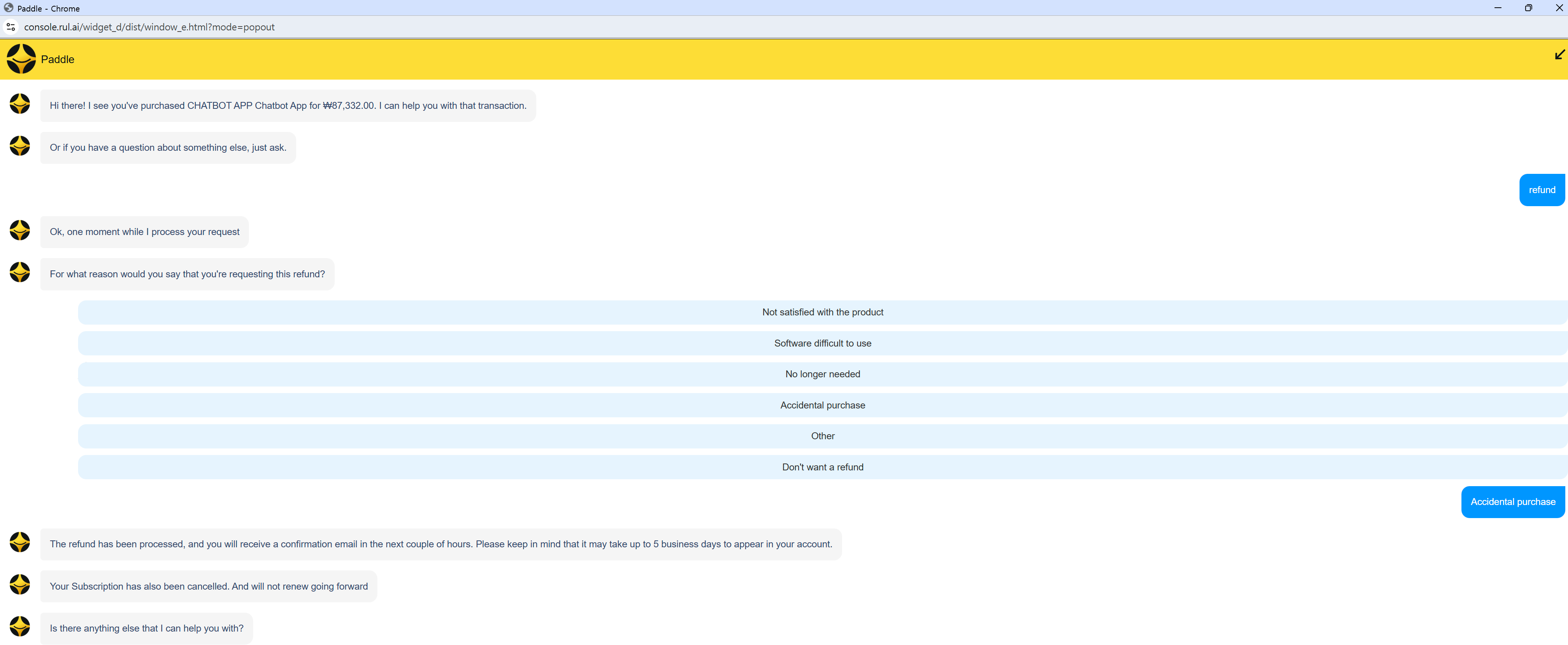 7. 채팅창에 Refund라고 입력. 환불 사유 고르라고 하는데 전 그냥 "Accidental Purchase" 고름.
